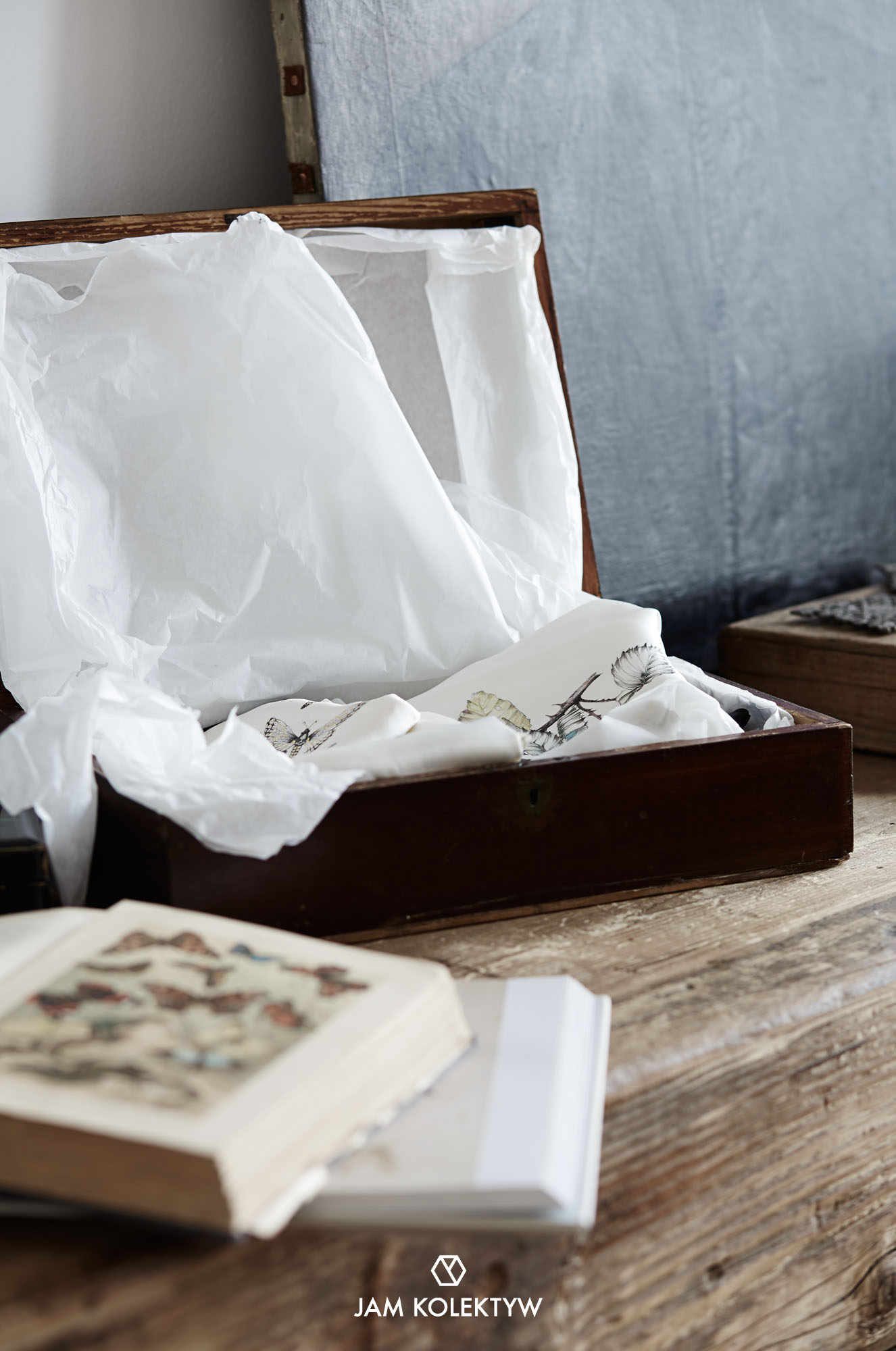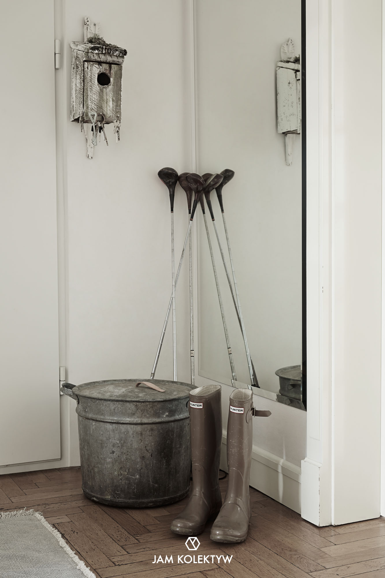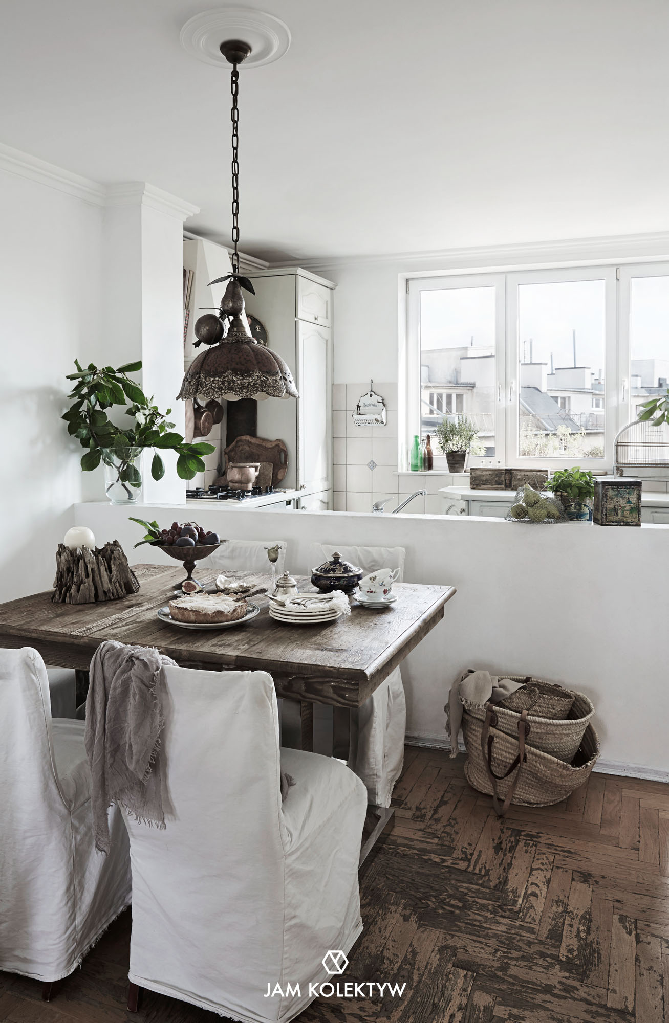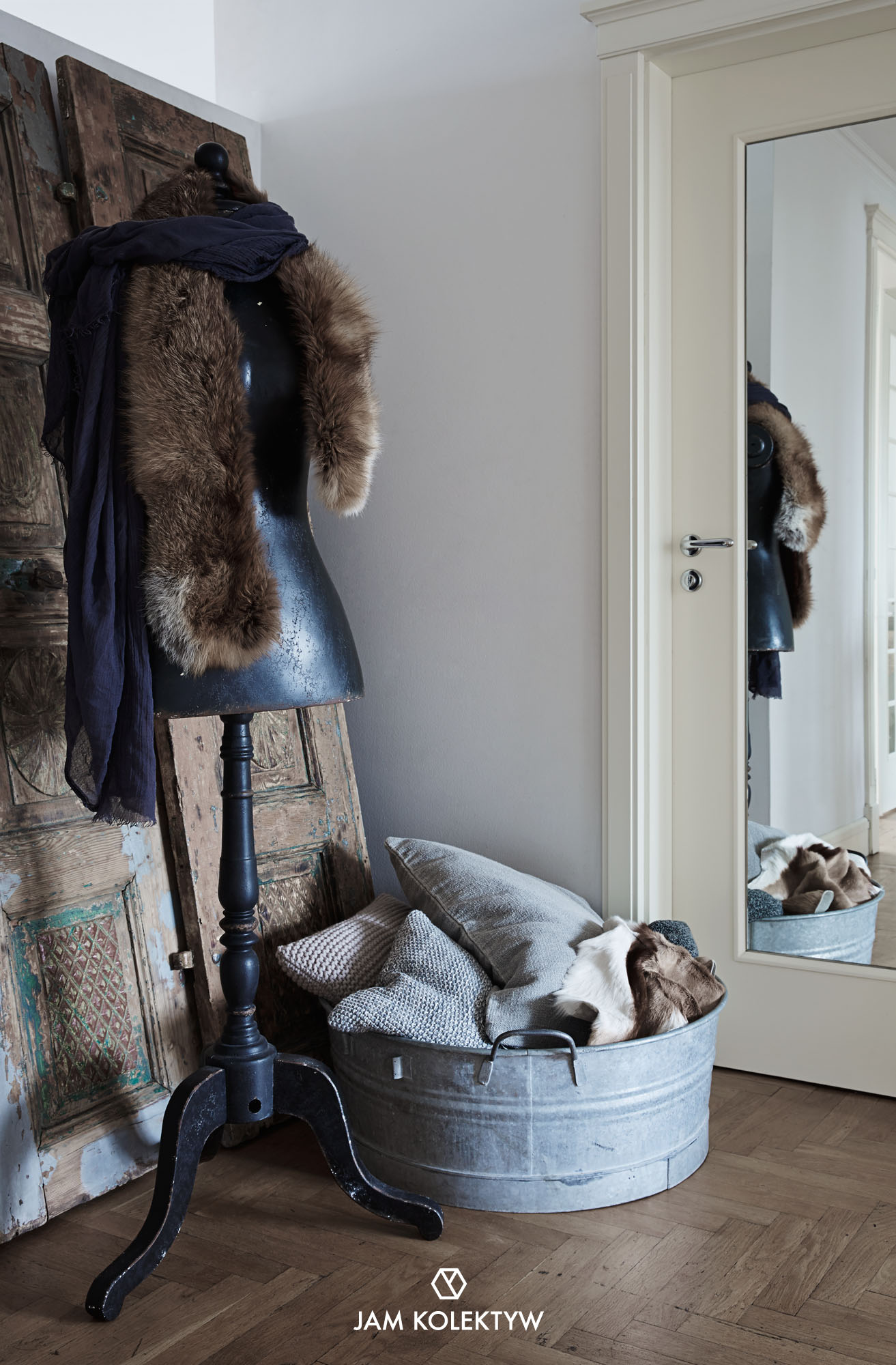 W przestrzeni dominują naturalne materiały. Wszystkie meble i dodatki zostały starannie dobrane przez właścicielkę, część z nich to rodzinne pamiątki, niektóre zostały kupione na targach staroci, albo w sklepach z antykami. Dom ozdabiają też jedwabne tkaniny – chusty i szale, malowane przez Katarzynę w zwierzęce i roślinne motywy.