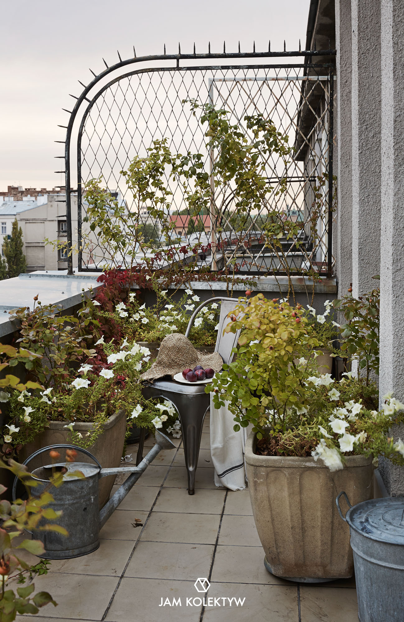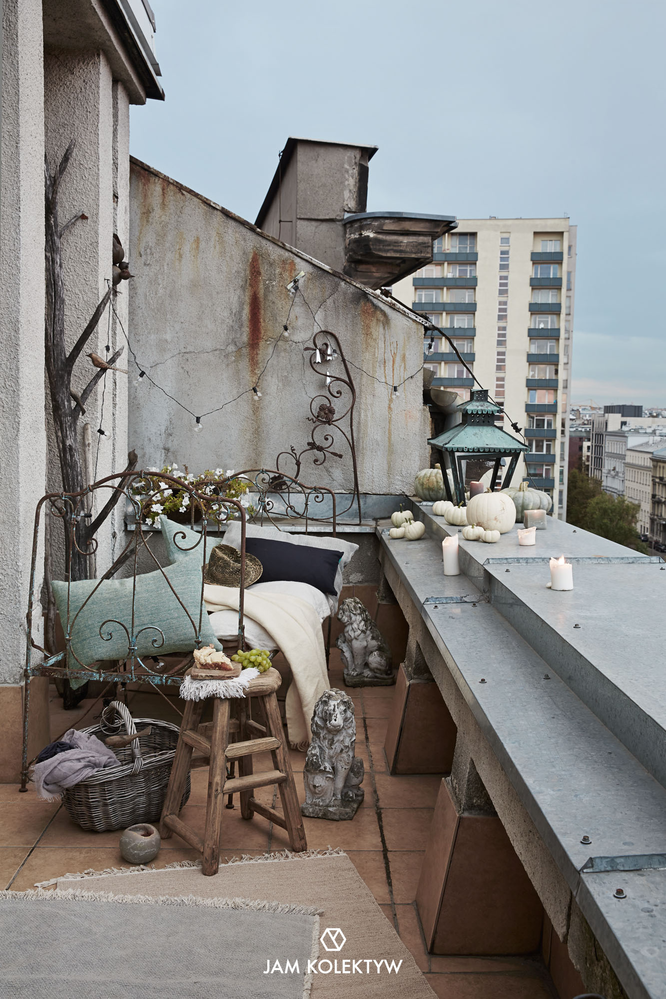 Mieszkanie – atelier Katarzyny Woynowskiej znajduje się na ostatnim piętrze kamienicy. Z tarasu rozpościera się niesamowity widok na centrum Warszawy.